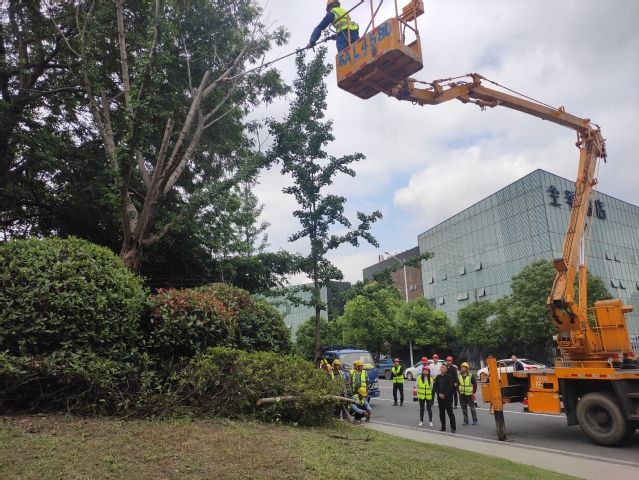 與此同時(shí),另一條指令隨即傳出,“河西大街樹木枯枝斷枝,存在極大安全隱患,立刻到場(chǎng)處置”。公司立即調(diào)配3輛園林搶險(xiǎn)車輛、1輛高架車,20名搶險(xiǎn)隊(duì)員第一時(shí)間趕到現(xiàn)場(chǎng)。指揮勘查險(xiǎn)情、實(shí)施圍擋、引導(dǎo)交通、處理險(xiǎn)枝,大家分工明確、操作熟練,搶險(xiǎn)過程一氣呵成。20分鐘后,這株干徑超過40厘米、高10米的大樹上的枯枝已全部修剪到位,解除了安全隱患。