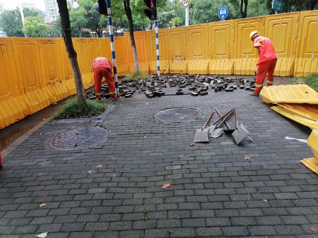 松花江西街是奧體中心片區(qū)成熟的住宅以及學校片區(qū)道路,兩側(cè)行道樹栽種的是梧桐樹,梧桐樹冠高大,夏季遮陰,冬季透光,但是由于根系發(fā)達,樹根會鼓出來把人行道磚“拱”起,一些路面變得凹凸不平,影響行人通行和道路美觀。公司市政養(yǎng)護隊伍在動工前,全面細致的排查了該路段,對各類隱患、病害問題進行了分類整理,并“一點一案”,制定整治解決方案。