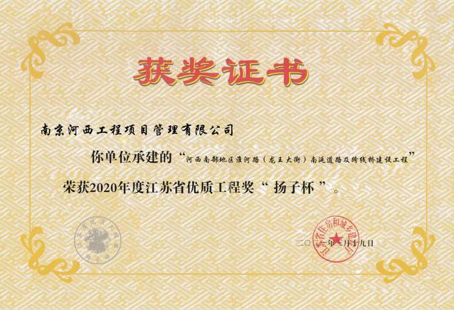 龍王大街項(xiàng)目“揚(yáng)子杯”證書