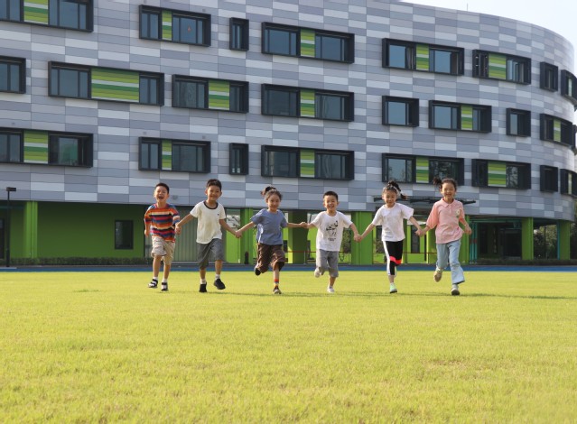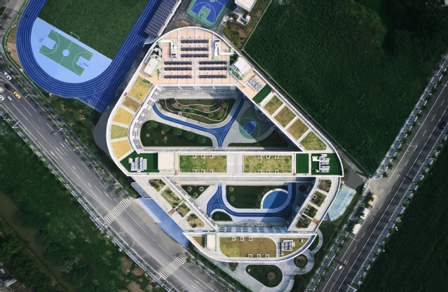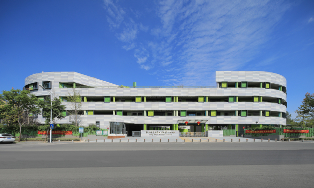 河西新城四小位于南京市建鄴區(qū)江山大街以北、黃山路以東,建筑面積2.79萬平方米,教學(xué)樓主體4層,局部3層,地下1層,建筑高度16.95米,可容納教職工和學(xué)生1705人。建筑整體采用扁平化“曰”字形結(jié)構(gòu),包含傳道授業(yè)的教學(xué)理念,造型可演化為鉛筆、書籍、綠葉,寓意在學(xué)習(xí)中獲得知識(shí)、不斷成長。