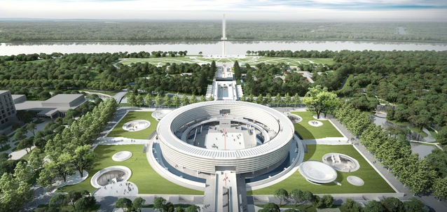 項目建設(shè)范圍總面積約為62000 平方米。建設(shè)內(nèi)容包含憲法展廳及宣誓廣場、法之谷城市綠坡及配套設(shè)施、場地東西兩側(cè)的人行天橋、場地東側(cè)的公園主入口廣場等(場地北側(cè)的濕地公園維持現(xiàn)狀,不做開發(fā))。容積率 0.09,建筑密度 9%,綠地率 36.8%。本項目總建筑面積為 29896 平方米,其中地上建筑面積 5584 平方米,地下建筑面積24312 平方米,建筑高度 16.5米,地上 2 層(首層架空),地下 1 層。功能包含展覽及地下車庫等。