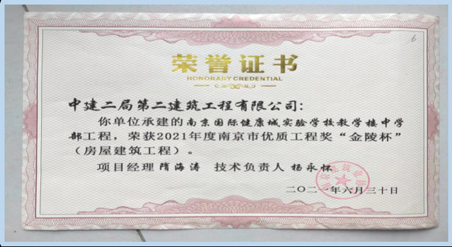 2021年12月6日,中國(guó)施工企業(yè)管理協(xié)會(huì)公布2020-2021國(guó)家優(yōu)質(zhì)工程獎(jiǎng)獲獎(jiǎng)名單,河西集團(tuán)新城公司所屬南京河西工程項(xiàng)目管理有限公司代建的南京國(guó)際健康城實(shí)驗(yàn)學(xué)校項(xiàng)目喜獲該獎(jiǎng)項(xiàng)。國(guó)家優(yōu)質(zhì)工程獎(jiǎng)設(shè)立于1981年,是經(jīng)國(guó)務(wù)院確認(rèn)的我國(guó)工程建設(shè)領(lǐng)域設(shè)立最早,規(guī)格最高,跨行業(yè)、跨專業(yè)的國(guó)家級(jí)質(zhì)量獎(jiǎng)。