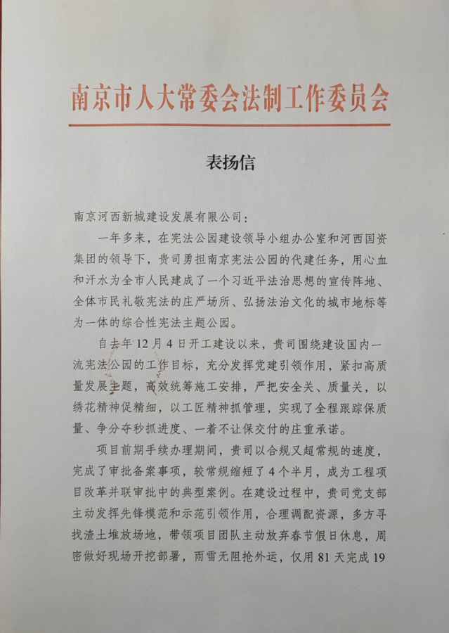 近日,河西集團(tuán)新城公司收到南京市人大常委會(huì)法制工作委員會(huì)表揚(yáng)信,信中對新城公司順利履約憲法公園項(xiàng)目代建任務(wù)表示了肯定與感謝。