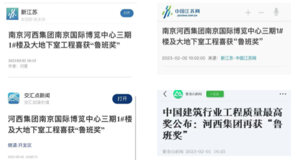 編者按:企業(yè)高質量發(fā)展,離不開高品質的產品。2022—2023年度第一批中國建設工程魯班獎名單近日公布,由河西集團投資,集團新城公司代建的南京國際博覽中心三期1#樓及大地下室工程榜上有名。對此,交匯點新聞、中國江蘇網、紫金山新聞等省市多家主要媒體進行了專題報道。